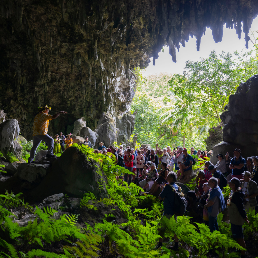 The island formation of Rurutu is not what one expects to see in the South Pacific. Its basalt and limestone cliffs are dotted with caves where the islanders once lived close to its white sand beaches and beautiful bays, whilst its volcanic interior hides a lush tropical jungle. Both combining to create stunning visuals for Aranui’s passengers. Archaeological digs have uncovered ancient settlements, council platforms and marae temples in the village of Vitaria, showing man’s presence around 900 A.D. Rurutu is known throughout Polynesia for the exceptionally fine quality of its woven products. From August to October each year, humpback whales can be seen and heard in Rurutu, where they come south to mate and give birth.